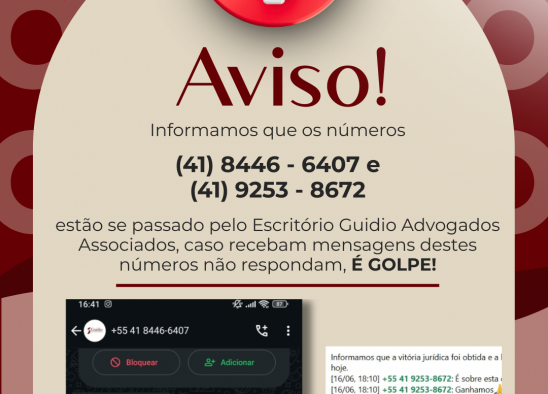 🚨 COMUNICADO IMPORTANTE AOS NOSSOS CLIENTES E PARCEIROS O escritório Guidio Advogados Associados informa que criminosos estão utilizando números...
